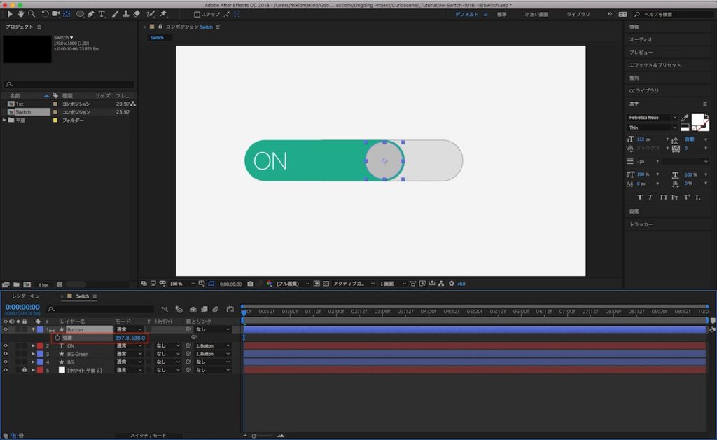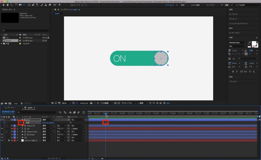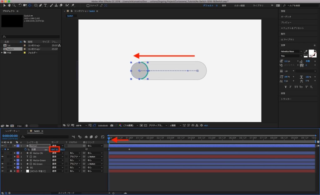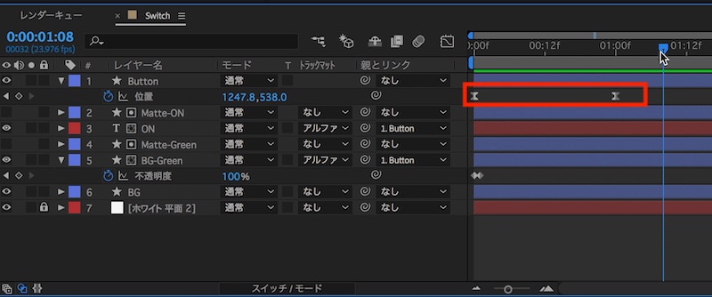 ここまでくれば後は簡単です。ノブ部分である「Button」のシェイプレイヤーにキーフレームを追加するだけ。「Button」のレイヤーを選択し「P」キーを押して位置のプロパティを展開します。