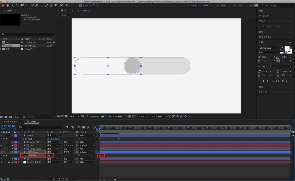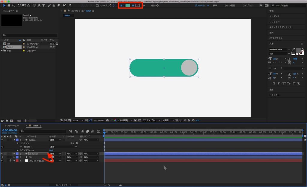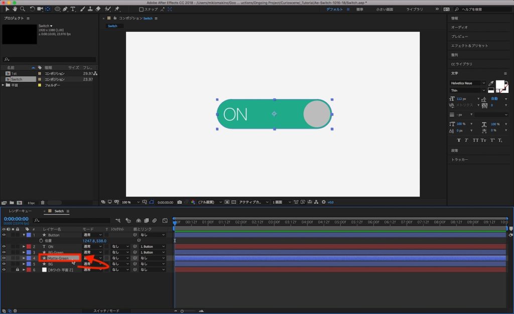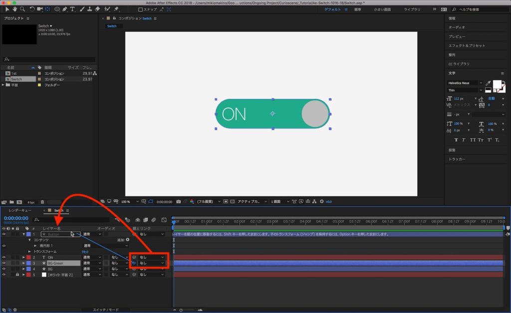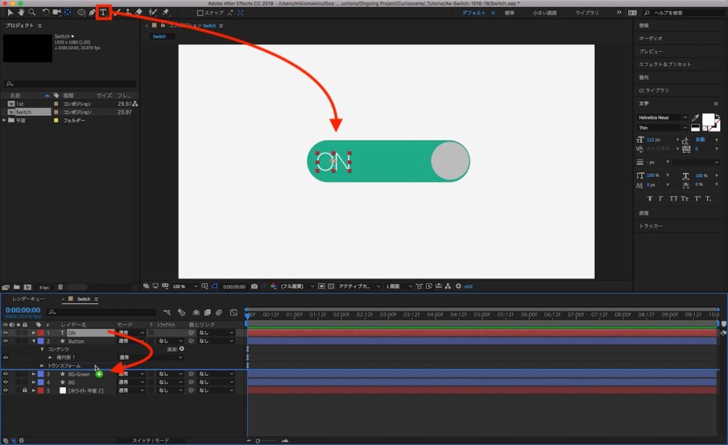 文字レイヤーのアンカーポイント中央にして、文字色を見やすい白に変更し、スイッチの左側に配置します。追加した「ON」の文字レイヤーは「BG-Green」真上に来るように配置します。