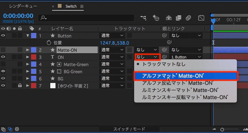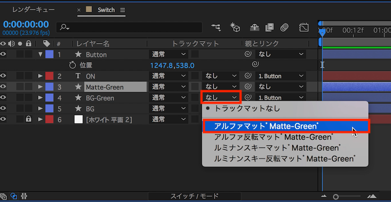 上のチュートリアルでなんとなくスイッチのイメージが付いたと思いますが、このままだとあまりリアリティが出てこないので、本来隠れていなくてはならない部分をトラックマットを使用して隠します。トラックマットは基本的に一つのレイヤーしか対応していないので、シェイプレイヤーの「BG-Green」、テキストレイヤー「ON」の真上にそれぞれ設定するようにします。