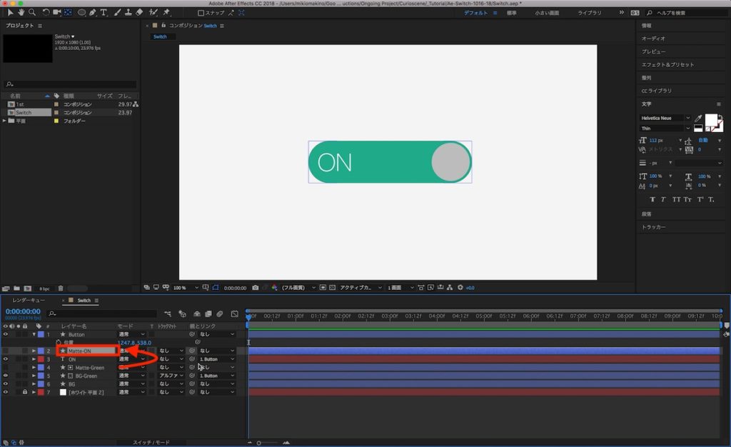 そして今度は「Matte-Green」を「Control(Cmd) + D」を使用して複製し、テキストレイヤー「ON」の真上に来るように調整し、名称を「Matte-ON」に変更します。