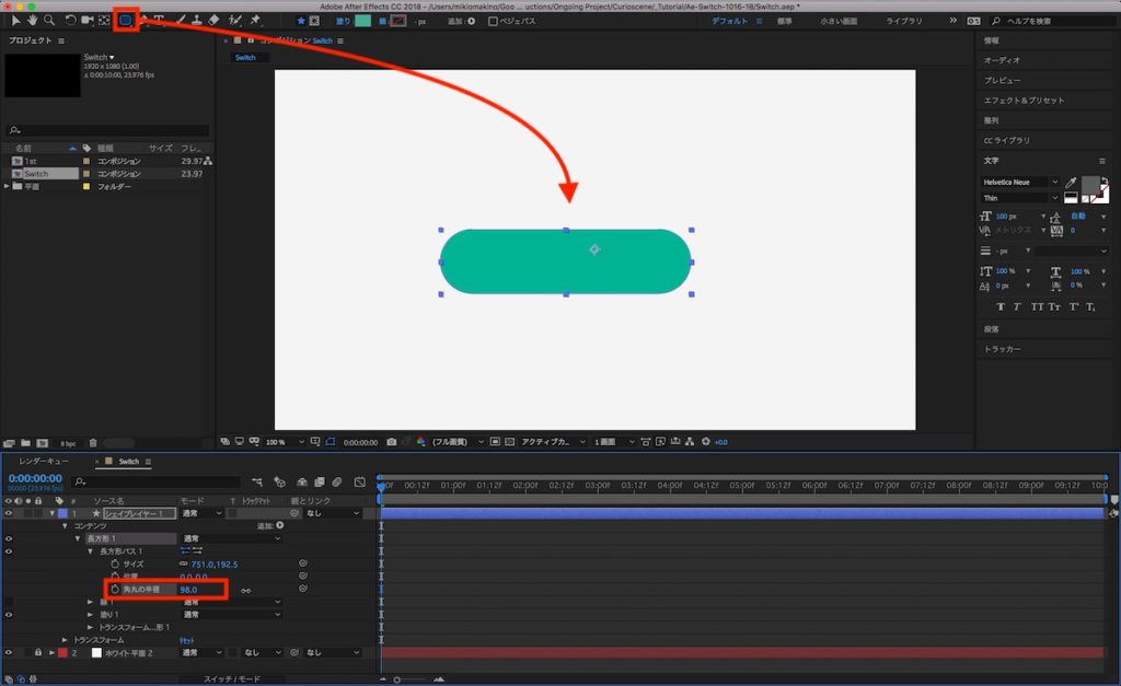 筆者は少し細長いデザインにしたので、角丸のシェイプを追加後、タイムラインにあるシェイプのレイヤーのオプションを展開し、「コンテンツ」、「長方形1」内にある「角丸の半径」の数値を大きくさせて、両端が丸くなるように設定します。