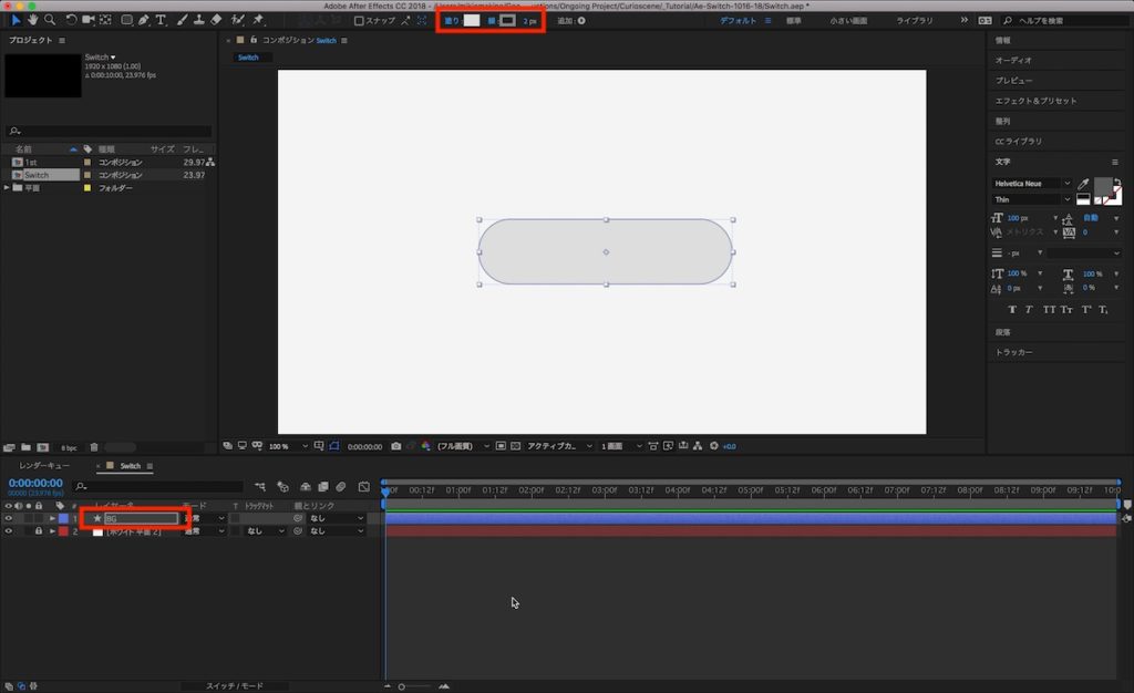 先程作成した背景のシェイプレイヤーである「BG」を作成し、ノブの下に来るようにします。オンの色になるように緑色や青色などに変更し、こちらのシェイプの線については「無し」にします。レイヤーの名称を「BG-Green」などに変更しておくと良いでしょう。