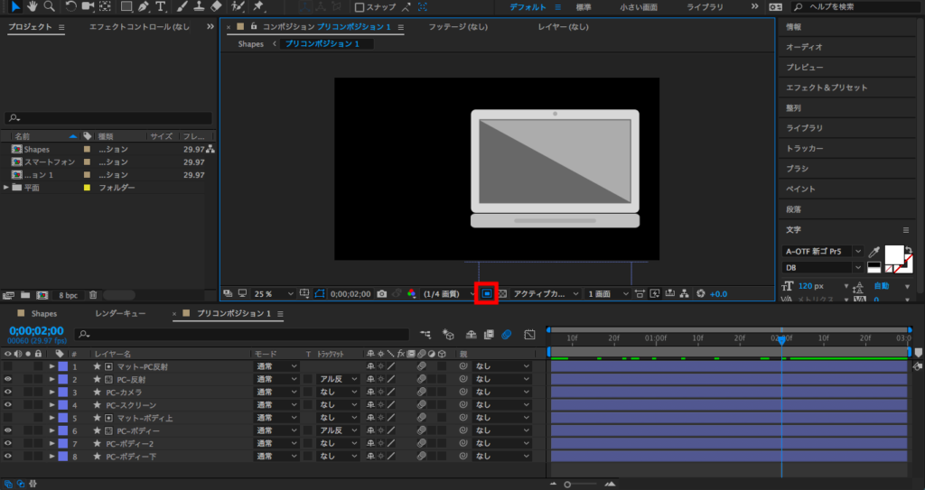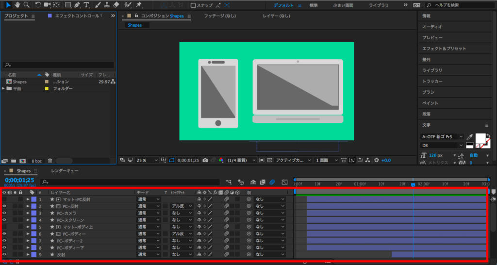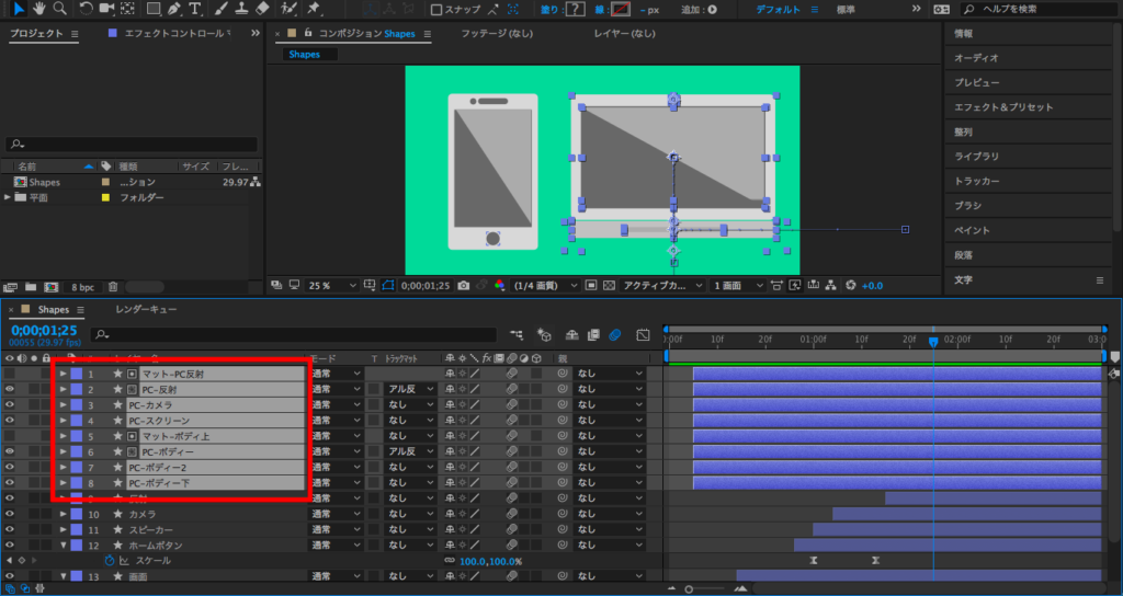 今回筆者はズラッと並んでいるレイヤーをPCとスマートフォンのアニメーションを分けようと思うので、まずPCのシェイプレイヤーを全て選択して、右クリック「プリコンポーズ」をクリックします。