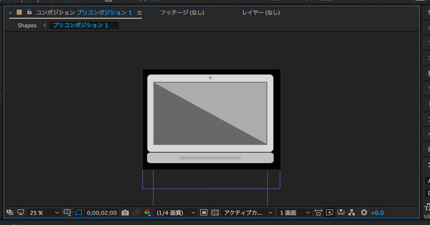 プリコンポジションを作成する際は元のコンポジションのサイズを継承されるので、16:9フルHDなどのサイズになりますが、プリコンポジションを行ったオブジェクトのサイズが小さい場合はコンポジションのサイズを変更すると良いでしょう。
