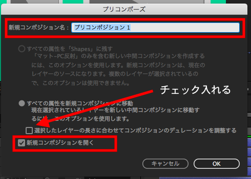 オプションが現れますが、基本的に「新規コンポジション名」に好きな名前を追加して、「選択したレイヤーの長さに合わせてコンポジションのデュレーションを調整する」と「新規コンポジションを開く」にそれぞれチェックをしておいて問題ありません。