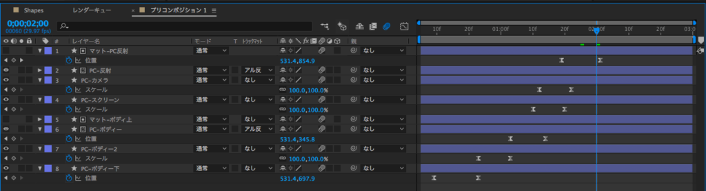 キュリオシーンで以前紹介したスマートフォンとパソコンのアニメーションを見てみると、一つのコンポジションに数多くのシェイプレイヤーが並んでおり、「PC-」などレイヤー名を変えていても少々見にくい状態になっています。