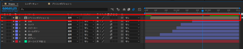 プリコンポーズは実に簡単で、グループ化したいレイヤーを選択することで適用する事ができます。