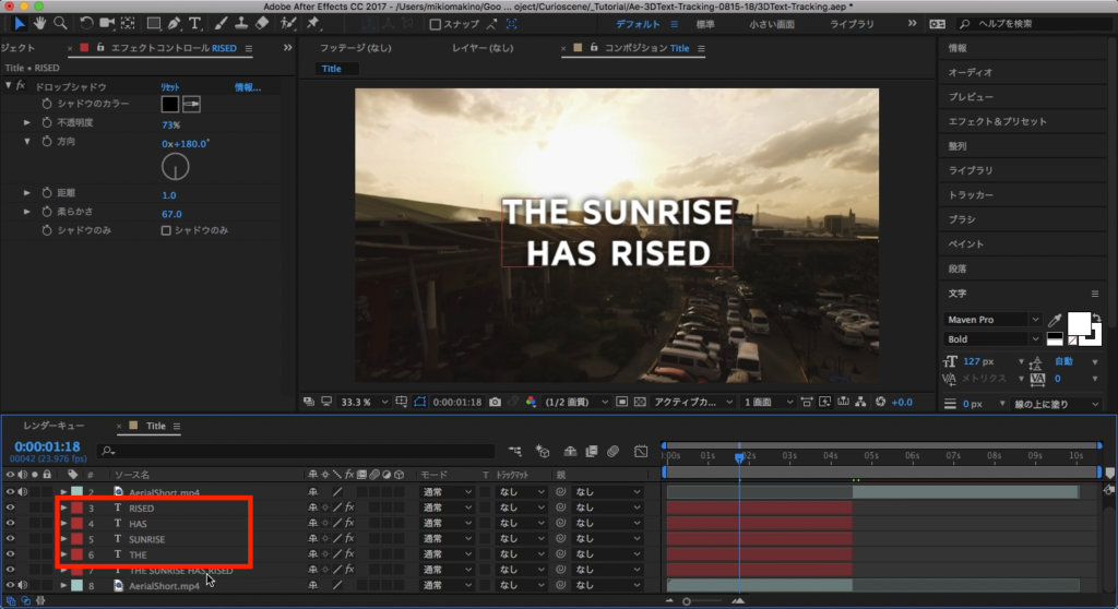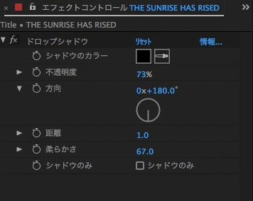 最後は「THE」、「SUNRISED」・・の順になるようにそれぞれのテキストレイヤーを少しずつ右にずらしていきます。これで最初のタイポグラフィーアニメーションが完成しました。
