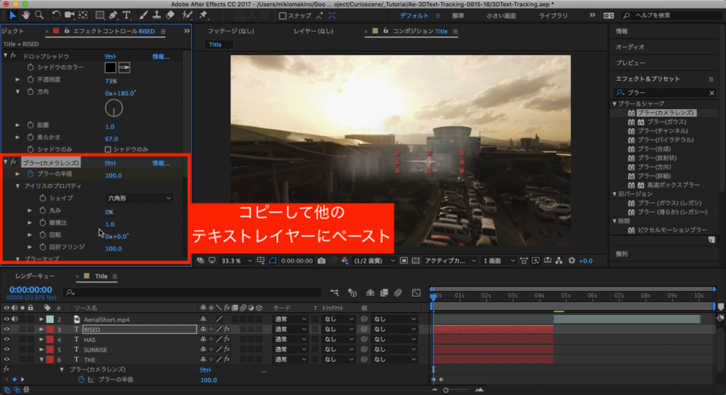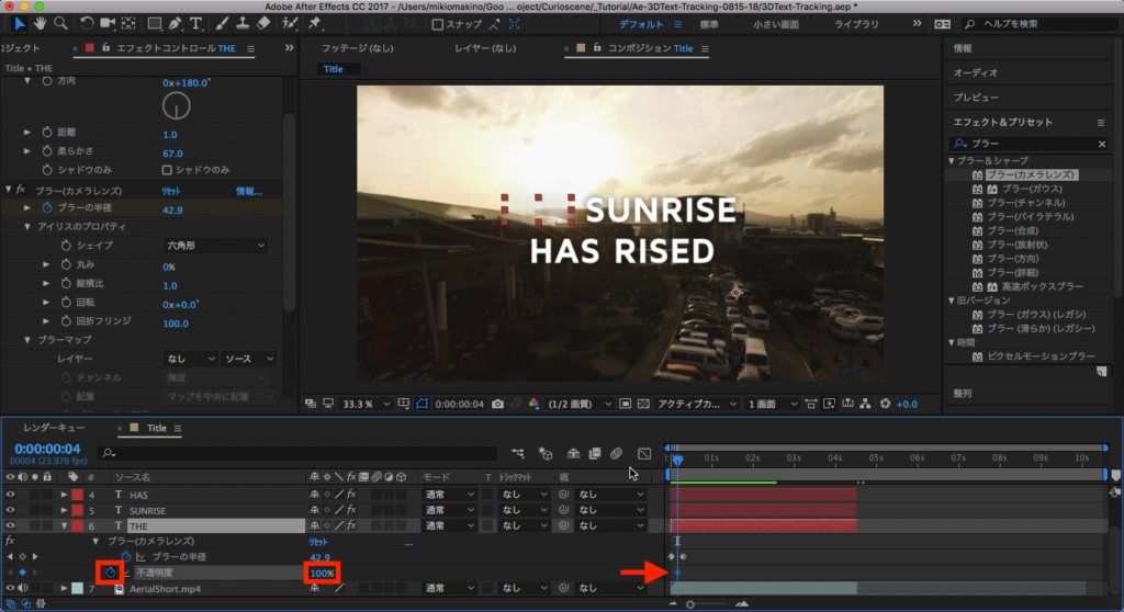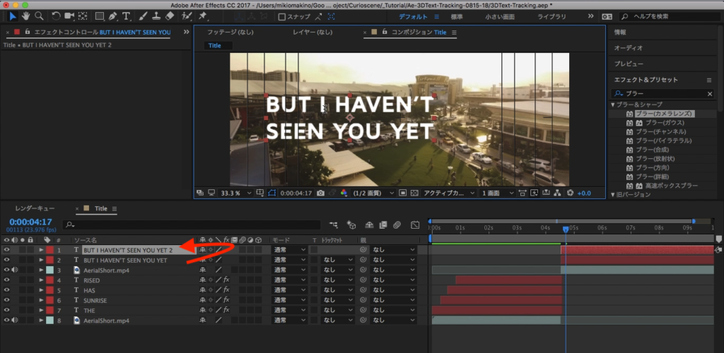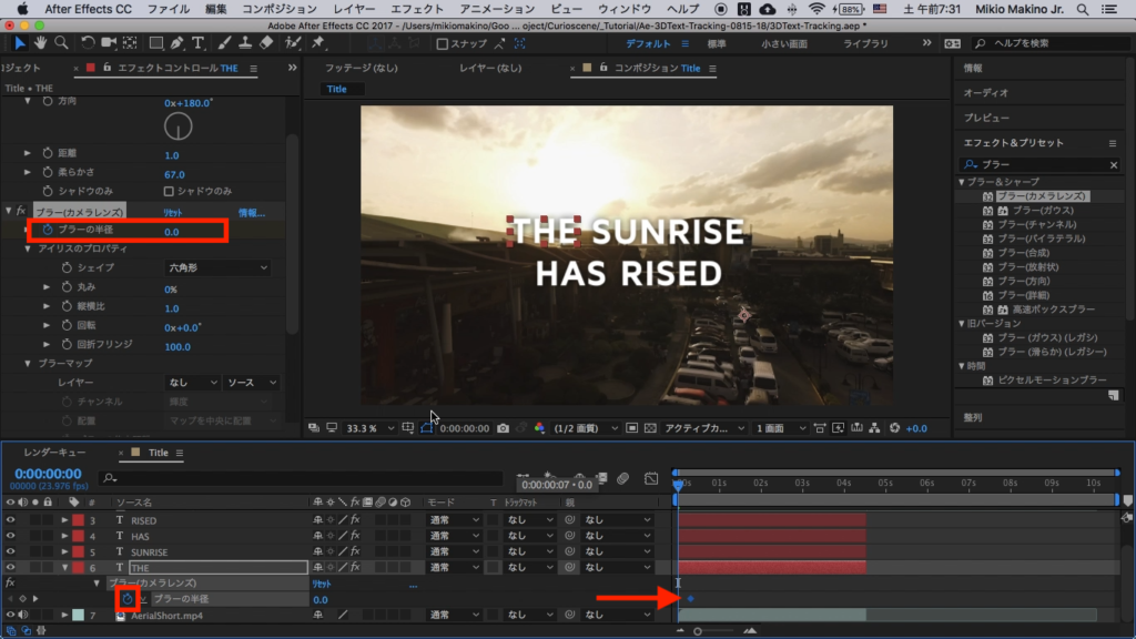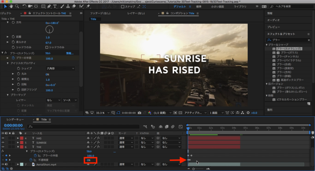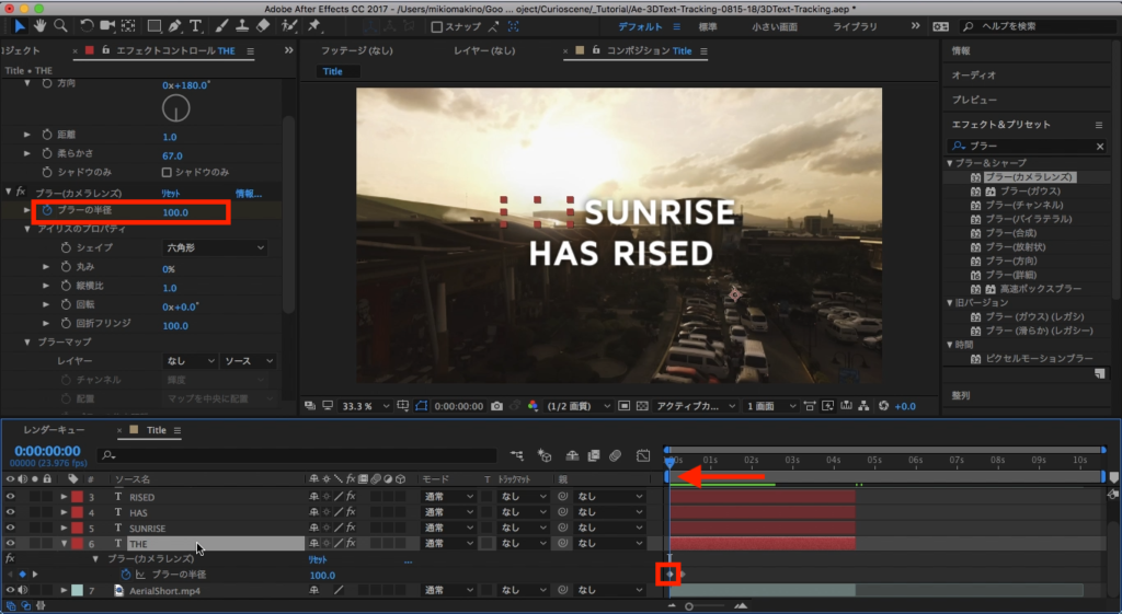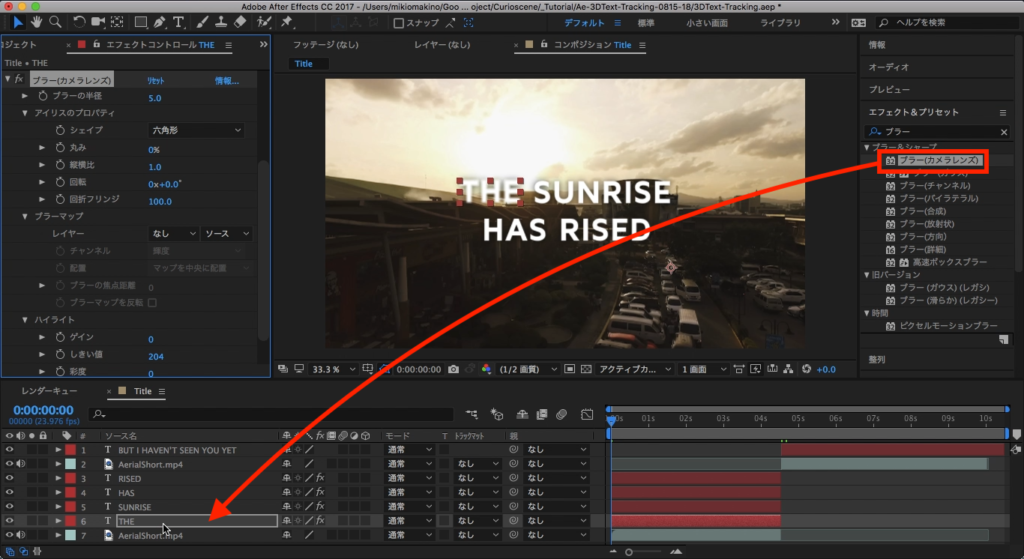 今度はエフェクトタブから「ブラー」と検索し、「ブラー(カメラレンズ)」を選択して、「THE」のテキストレイヤーに追加します。