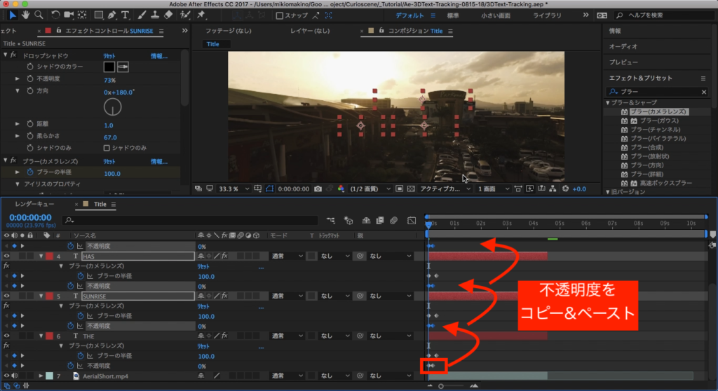 これで「THE」の文字のアニメーションが完成しました。「THE」で使用したブラーのエフェクトをコピーし、他の単語全てにペーストするとキーフレームが全て同じように適用させられます。