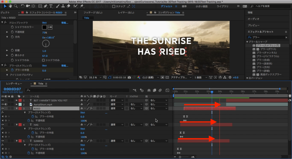 最初の部分はZeddのミュージックビデオと同じようにそれぞれの単語をブラーを使用して現れるようにしましょう。まずは「エフェクト」タブから「ドロップシャドウ」と検索し、先程配置した全てのテキストレイヤーに適用させます。