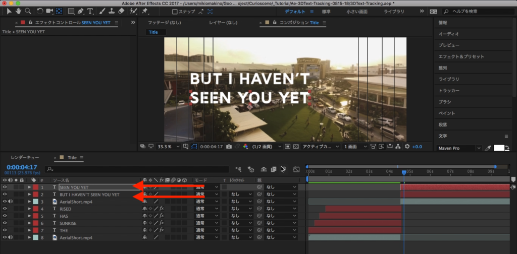 こちらはキュリオシーンでも度々紹介しているトラックマットを使用してアニメーションを作成していきます。テキストレイヤーを選択し、先ほどと同じように文字を複製して「BUT I HAVEN’T」、「SEEN YOU YET」の2つのレイヤーにします。