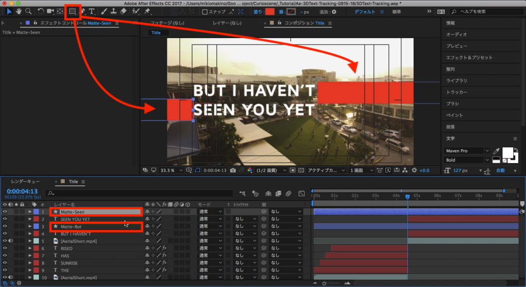 「BUT」は右側から、「SEEN」は左側から現れるようにしたいので、テキストが隠れる程度の大きさのシェイプをツールバーにあるシェイプレイヤーを使って、それぞれテキストの隣に配置します。追加したシェイプはわかりやすく「Matte-」の名前を付けるなどすると良いかもしれません。