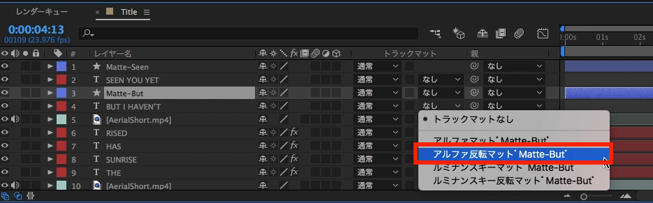 タイムライン上でのシェイプは必ずテキストレイヤーの真上になるように整列させ、「トラックマット」の項目からそれぞれ「アルファ反転マット」を選択し、追加したシェイプを指定するようにします。