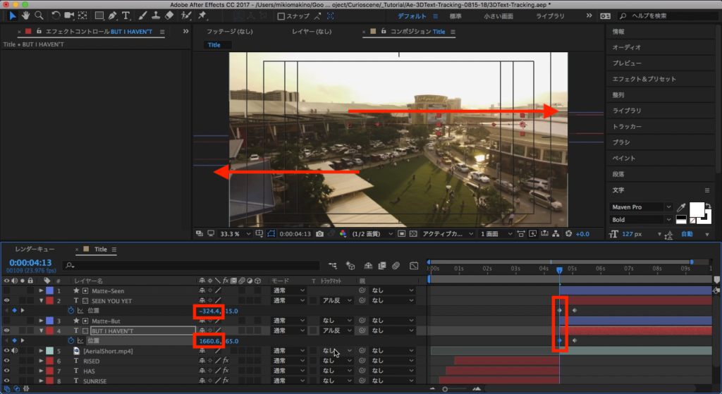 そして2つ目の映像が始まるくらいにタイムインディケーターを動かし、テキストレイヤーの位置を数値で変更するか、コンポジション上で動かして、左右から現れるようにします。