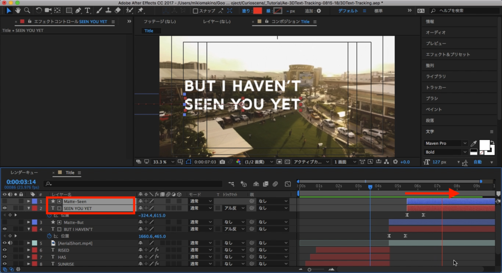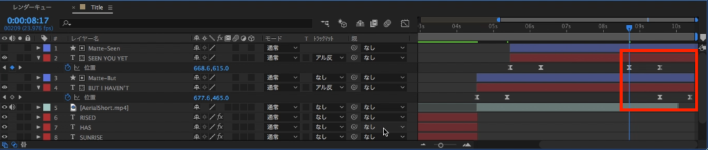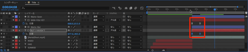 2つのテキストのタイミングをずらしていきたいので、「SEEN YOU YET」のテキストレイヤーとトラックマットのレイヤーを選択し、右側に動かします。