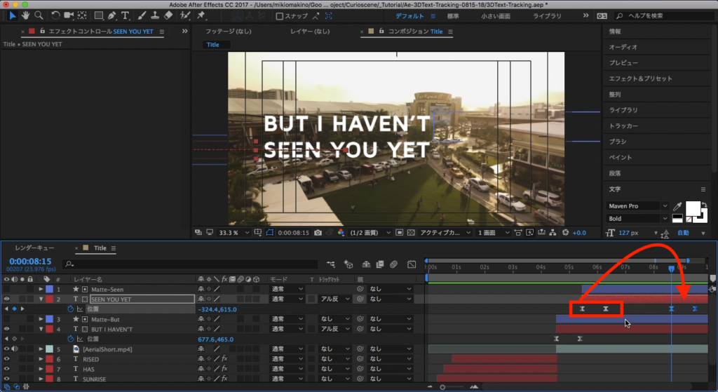 しかし、今回は「BUT I HAVEN’T SEEN YOU YET」は空中に浮いているような演出をしたいので、3つのトラックポイントは指定せず、元々あった文字に近い位置にあるトラックポイントを指定しました。