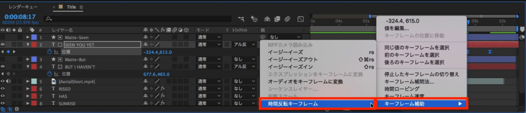 追加したキーフレームを2つ選択して、右クリック「キーフレーム補助」から「時間反転キーフレーム」をクリックしてキーフレームを反転させます。同じようにもう一つのテキストレイヤーに適用させましょう。