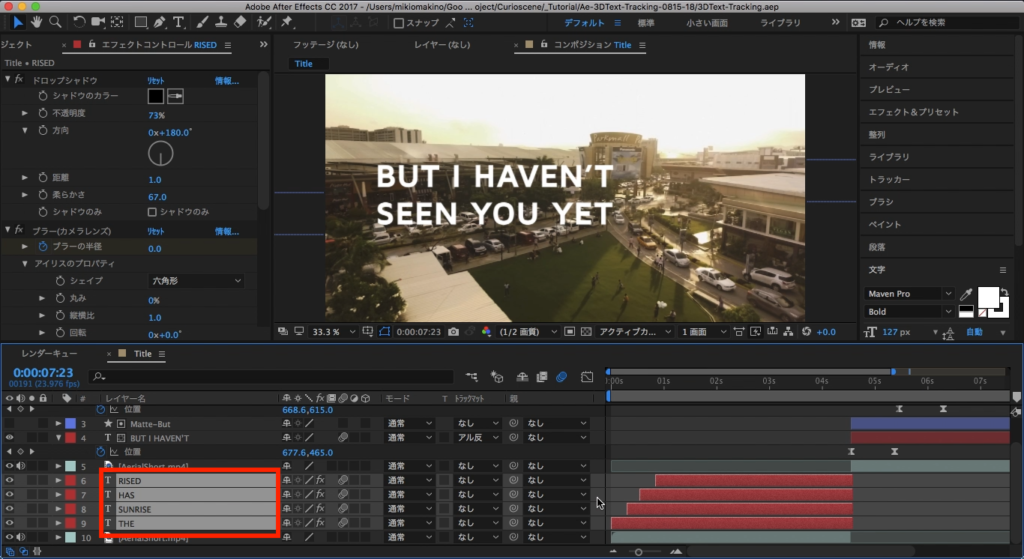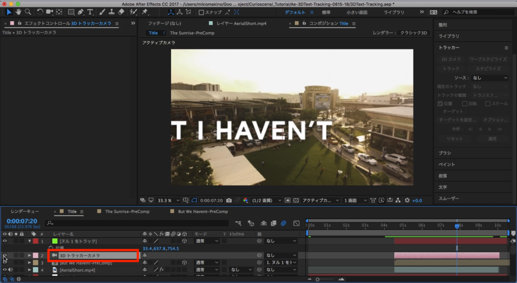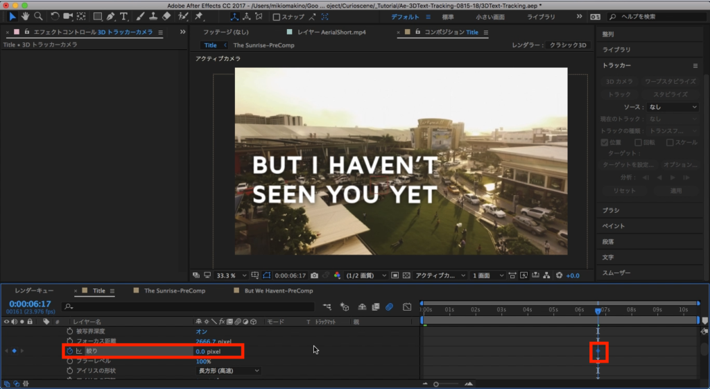 次は「BUT I HAVEN’T SEEN YOU YET」の部分です。映像を見る通り後半部分のドローンの動きは前方に向かっているので、先程使用した平面ではなく空間を上手く使ってテキストを馴染ませる必要があります。After Effectsのトラッカーにはそのエフェクトを実装できる「3Dカメラ」という機能も搭載されており、映像の空間情報を分析して好きな位置にプリコンポジションやシェイプレイヤー、画像、映像などといったオブジェクトを配置することが出来るようになります。