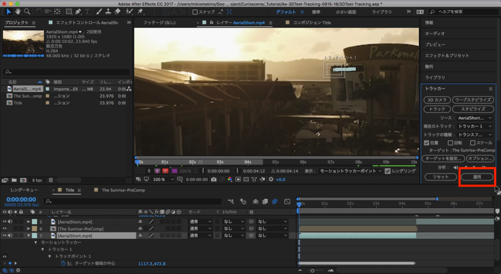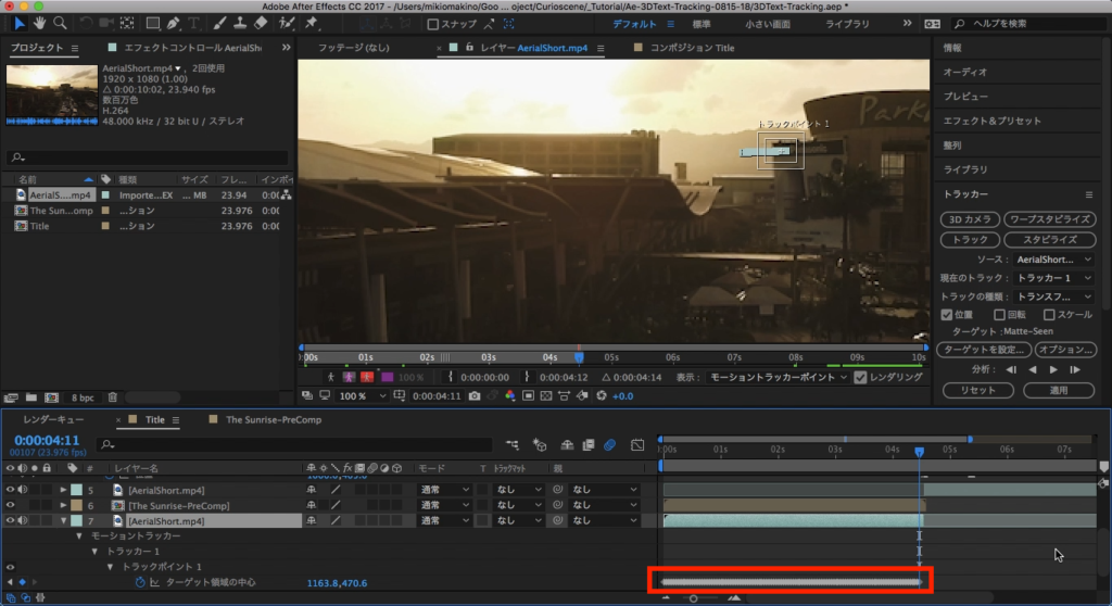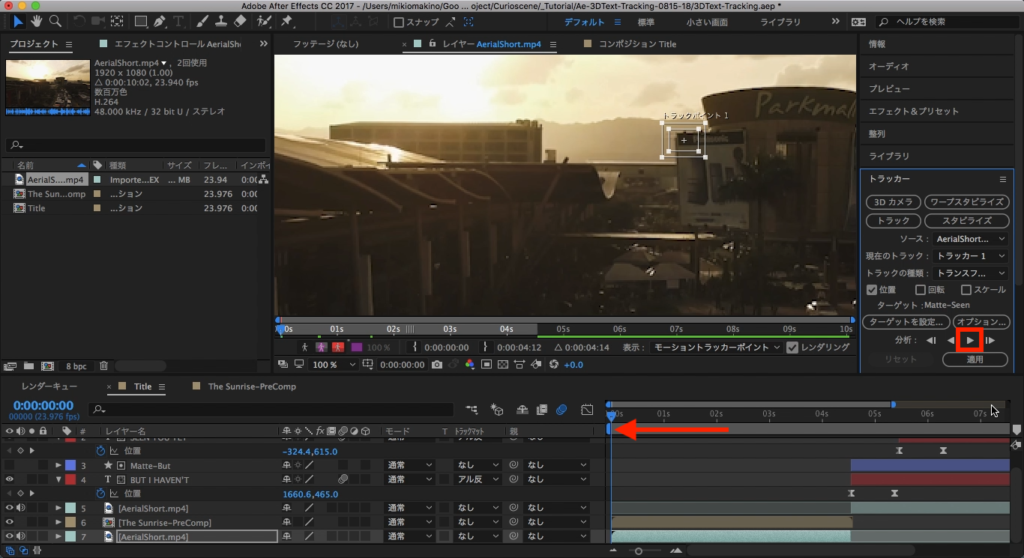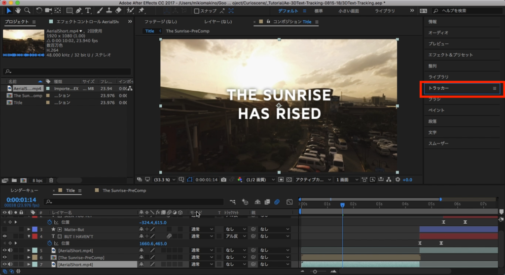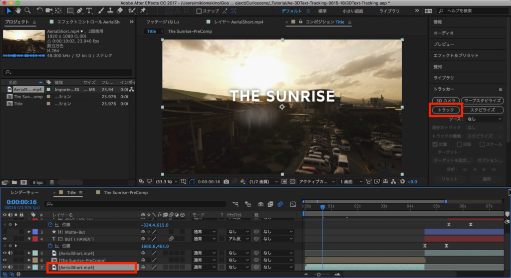 トラッカーのタブには色々なボタンがありますが、ひとまずトラッキングの対象となるソースを指定する必要があります。最初は「THE SUNRISE HAS RISED」の部分からになるので、最初の部分のフッテージを選択し、トラッカータブの中にある「トラック」をクリックします。
