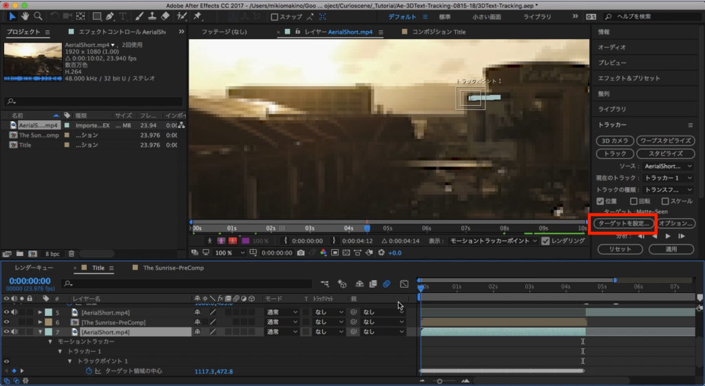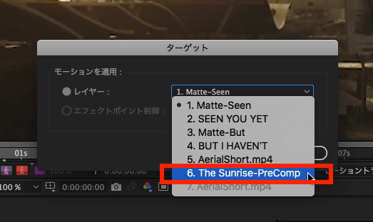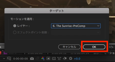 トラッカーのタブに戻り、「ターゲットを設定」をクリックし「ターゲット」のウィンドウから「THE SUNRISE HAS RISED」のプリコンポジションを選択し、「OK」をクリックします。