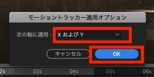 最後は同じくトラッカーのタブから「適用」をクリックし、「モーショントラッカー適用オプション」の「次の軸に適用」では「X および Y」を選択して「OK」をクリックします。すると、トラックポイントをもとにプリコンポジションが移動されるようになりました。
