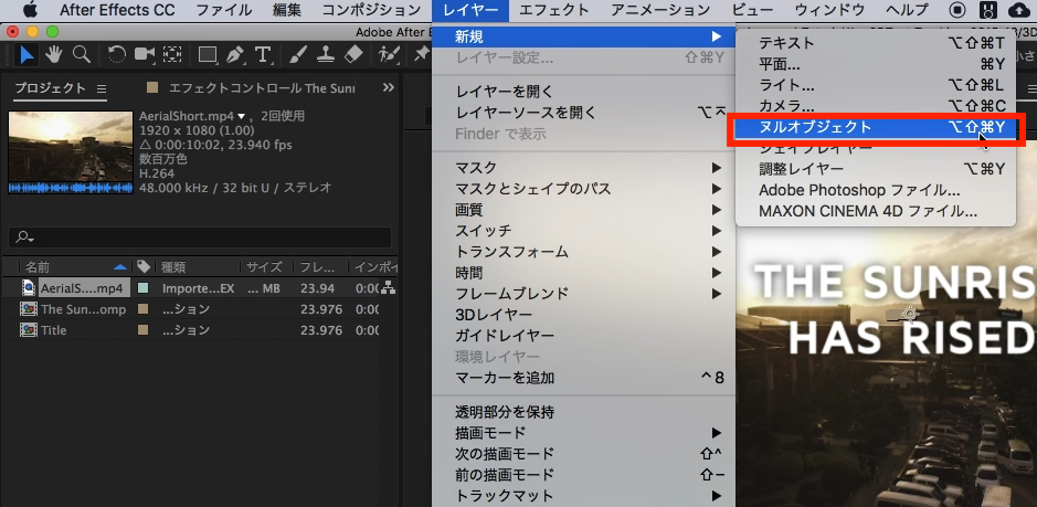 ただトラックポイントを軸にするので、プリコンポジションが大きくズレる場合があります。その際は上部メニューの「レイヤー」から「新規」、「ヌルオブジェクト」をクリックして、新しくヌルオブジェクトを追加します。