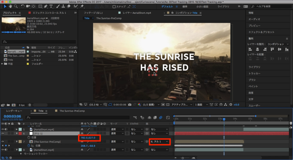 そして移動させたいプリコンポジションの親要素をヌルに指定させ、ヌル内にある「位置」のプロパティを操作することで追加されたトラッカーに影響を与えずに位置を移動させる事ができるようになります。