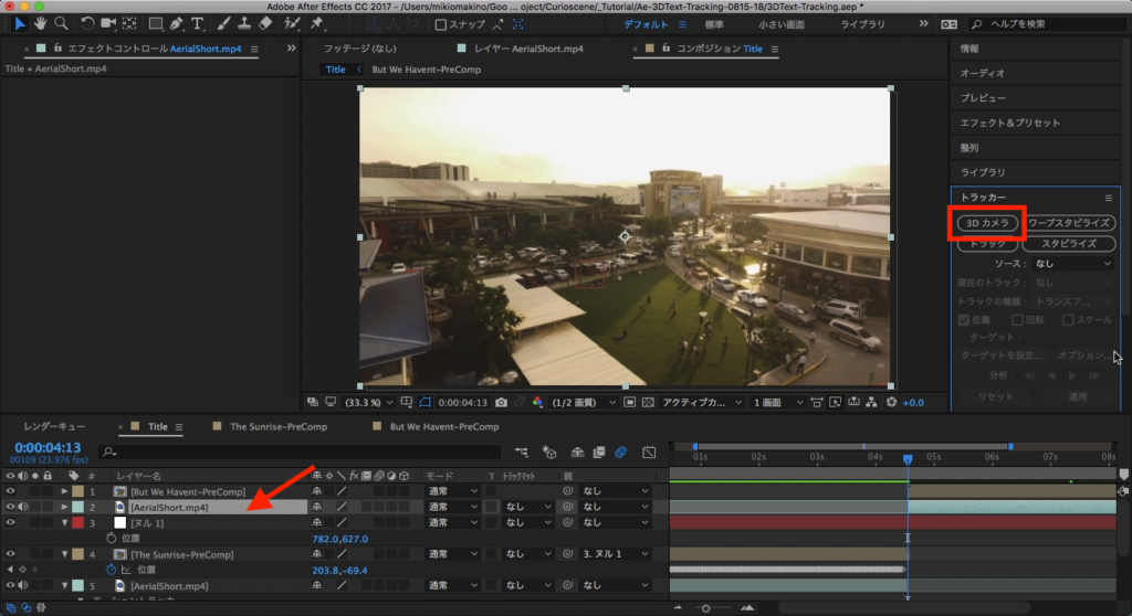 後半部分の映像を選択し、タイムインディケーターを映像がスタートするタイミングに持っていって「トラッカー」のタブにある「3Dカメラ」をクリックします。