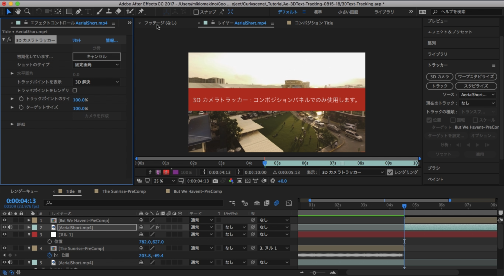 先程作成したテキストアニメーションは良い感じに出来上がっているので、人によってはそのまま使用しても問題ないとは思います。しかし、After Effectsに搭載されているモーショントラッキングの機能を使うことで、より映像に馴染ませることが出来るのでオススメです。トラッキングの設定方法等はまた別の機会に詳しく紹介していきたいと思いますが、今回は平面でのトラッキングと3Dカメラの両方を使用した方法で作っていきましょう。