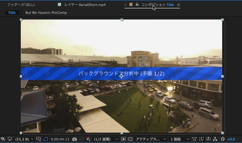 操作によっては「3Dカメラトラッカー:コンポジションパネルでのみ使用します」と出てくる場合があるので、その際はコンポジションを表示させましょう。分析のコンポジションを開くと「バックグラウンドで分析中」というダイアログが現れます。
