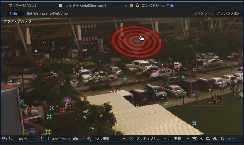 分析が完了後、コンポジションには無数のカラフルな「X」アイコンが表示されるようになります。これはトラッキング可能なトラックポイントになっており、1つのポイントまたは3つ隣接したトラックポイントを選択して、角度や空間に合わせた形でオブジェクトを配置出来るようになります。
