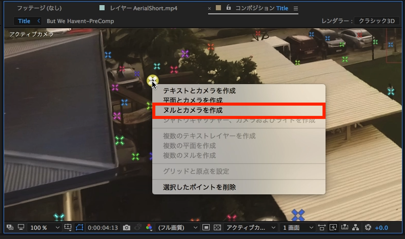トラックポイントを一つ指定し、右クリックをすると複数のオプションが出るので、ここは「ヌルとカメラを作成」をクリックします。