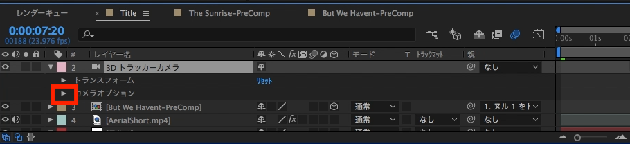 上記の3Dトラッカーカメラを追加してことで、に新しく「3Dカメラ」というレイヤーが現れるようになりました。カメラが前方に移動すると「BUT..」のテキストが被写界深度の影響でボケ味が出るように追加していきましょう。まずレイヤーにある「3Dトラッカーカメラ」の三角形アイコンをクリックし、プロパティを展開させ、その中にある「カメラオプション」を展開させます。