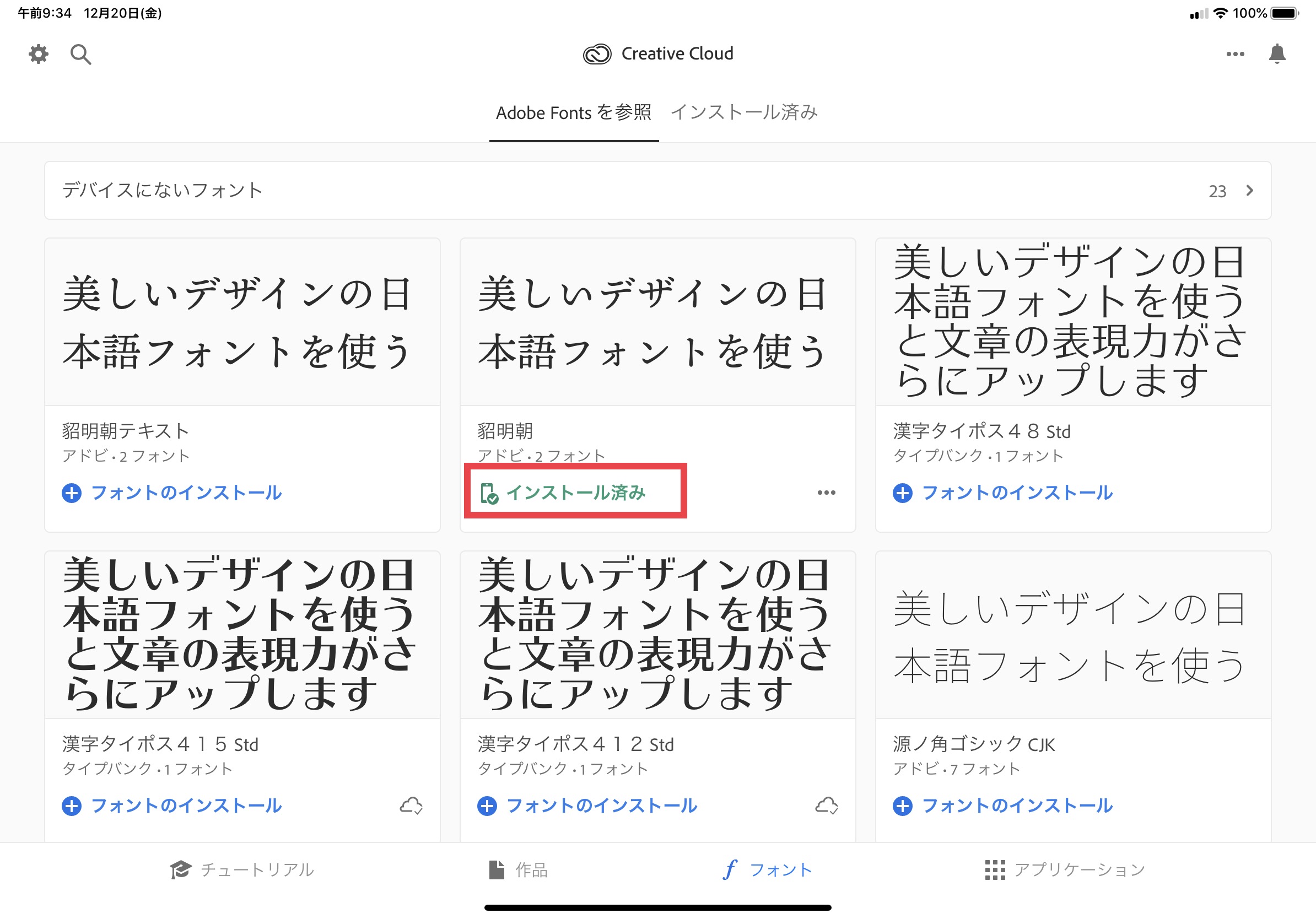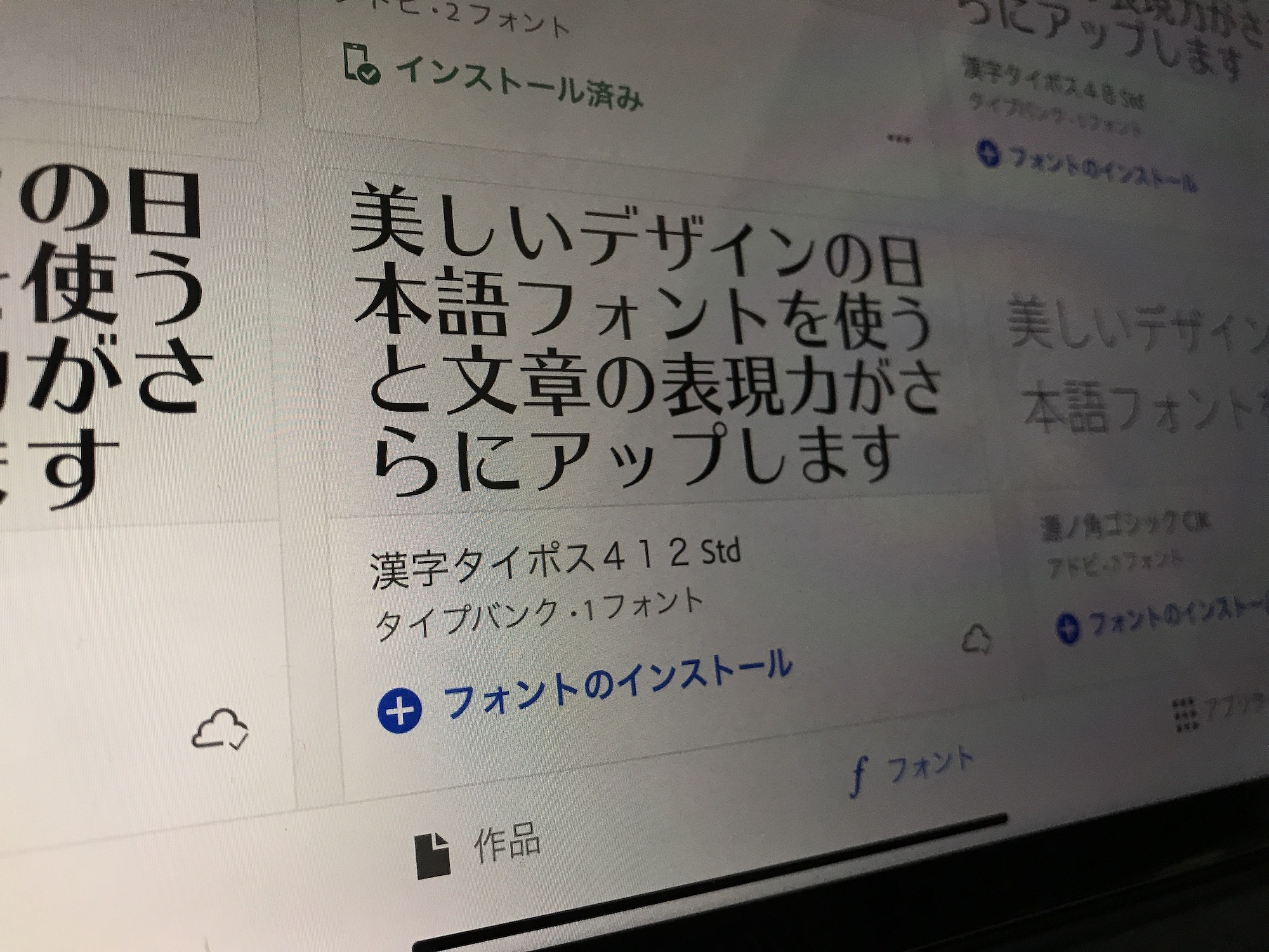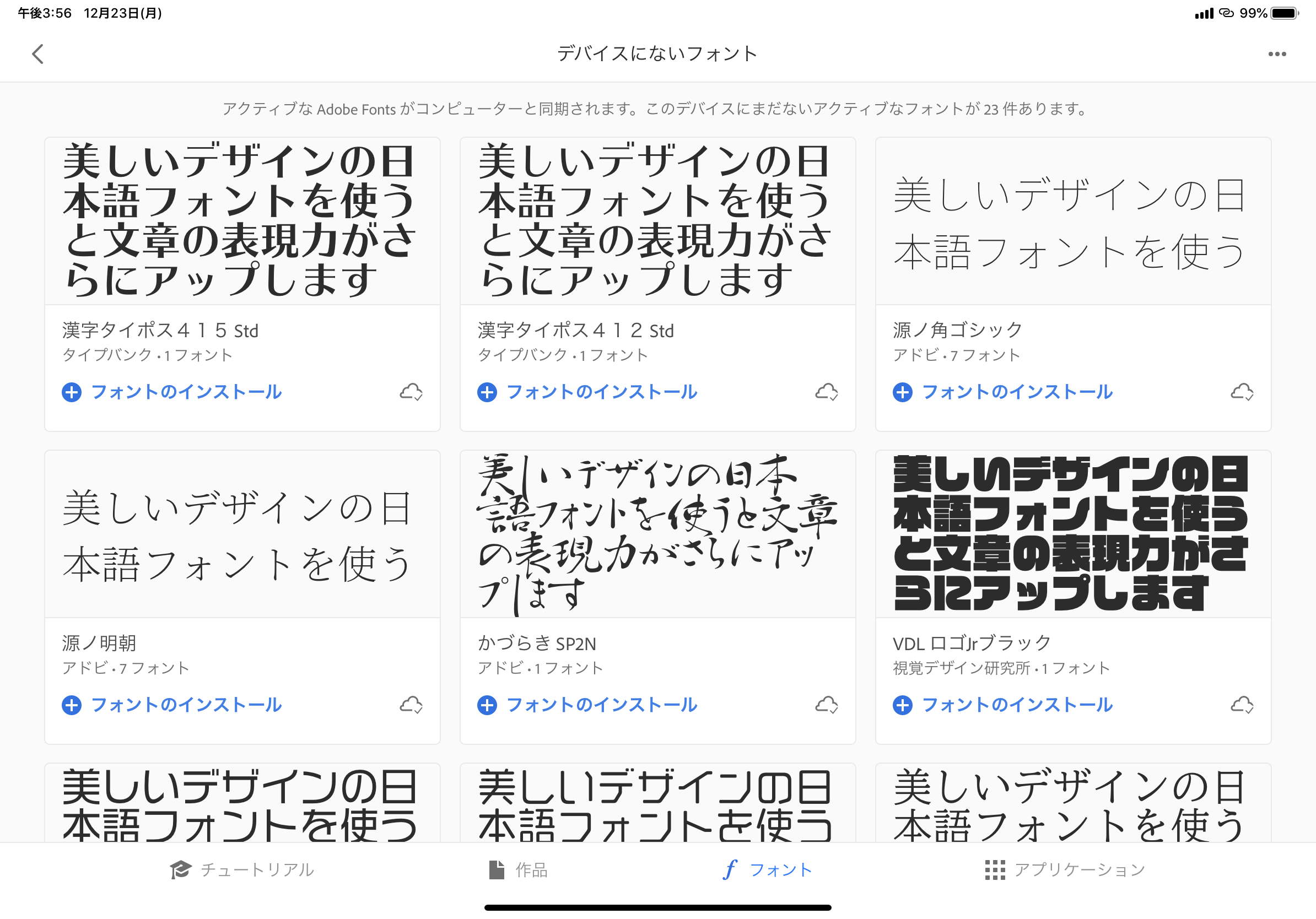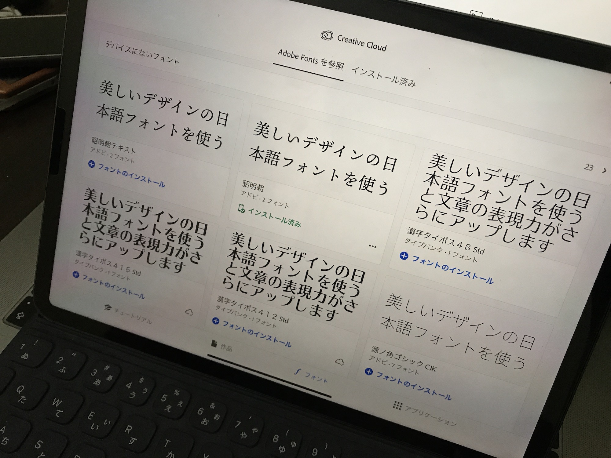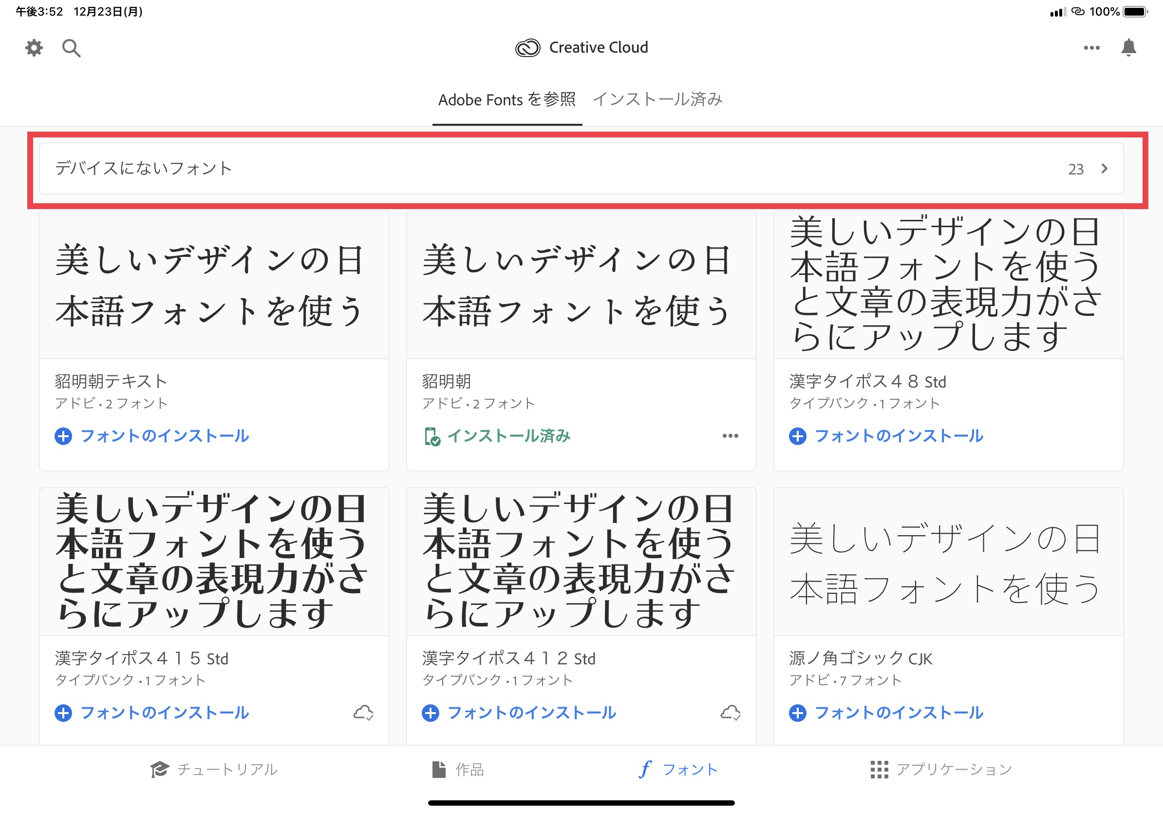 そのため、過去に入手したフォントはCreative Cloudアプリの「フォント」から「デバイスにないフォント」をタップすると一覧表示されるので、「フォントのインストール」をタップすれば良いでしょう。