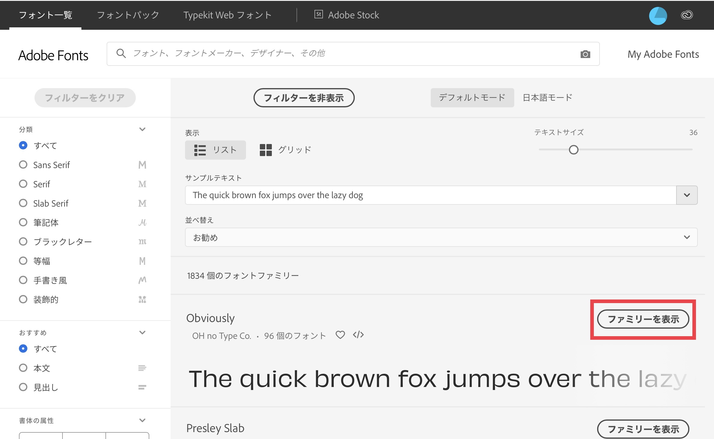 トップページのフォント一覧または左側にある「分類」や「書式の属性」からフィルタリングして入手したいフォントを見つけ、「フォントファミリーを表示」をクリックします。