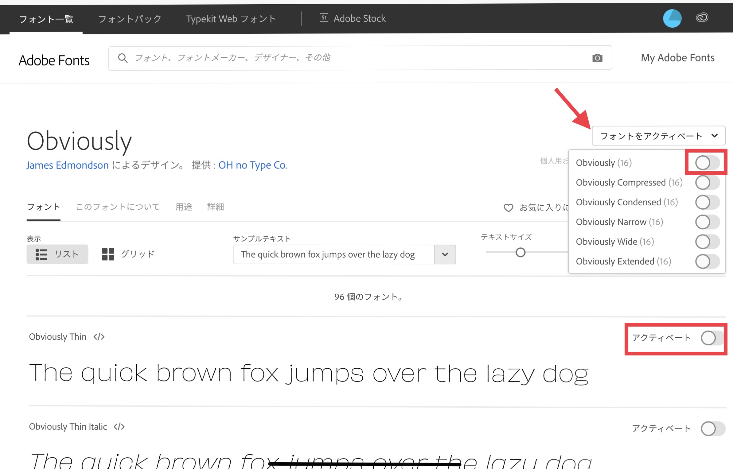 するとフォントの詳細ページに移るので、右側にある「アクティベート」のスイッチをオンにして、フォントを同期させます。