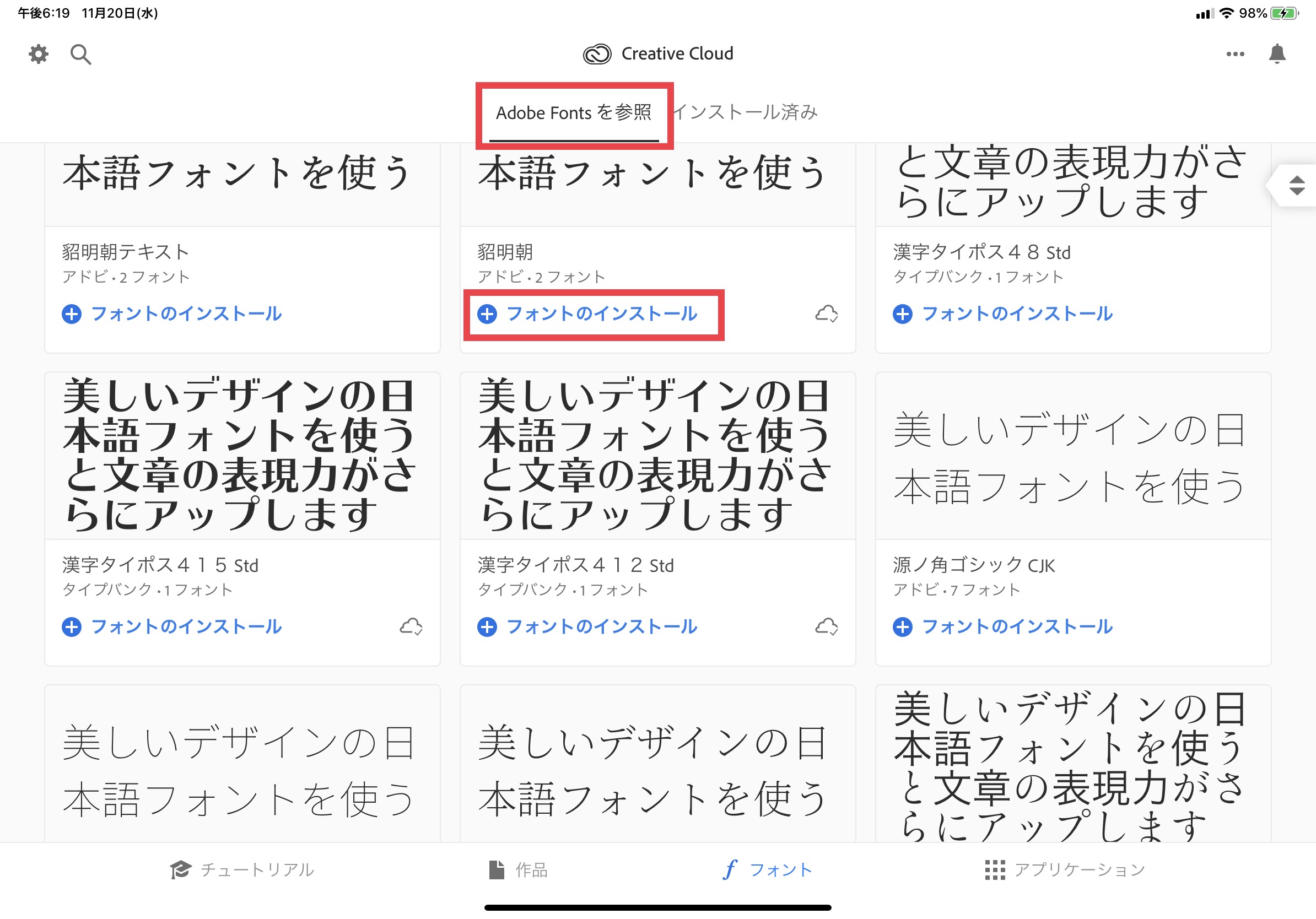 「Adobe Fontsを参照」のタブに表示されるフォント一覧から、入手したいフォントを探し出します。
