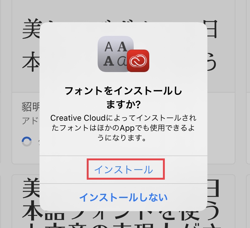 「フォントのインストール」をタップすると、下の「フォントをインストールしますか?」のポップアップが現れるので、「インストール」をタップし、「インストール済み」と表示されたらデバイスへの同期が完了します。