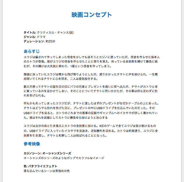 筆者の場合はあらすじ、ジャンル、デュレーション(尺)、参考にする作品、主なロケーションの5つの情報があれば大まかなイメージがつくので、このフォーマットを利用しています。