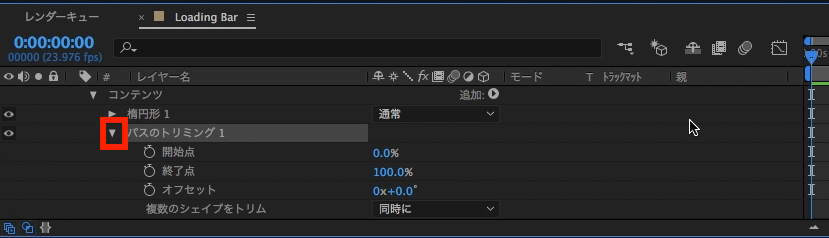 シェイプレイヤーを選択して三角形アイコンをクリックし、中のオプションを展開させ、「コンテンツ」の欄にある「追加」をクリックして、「パスのトリミング」を選択しましょう。