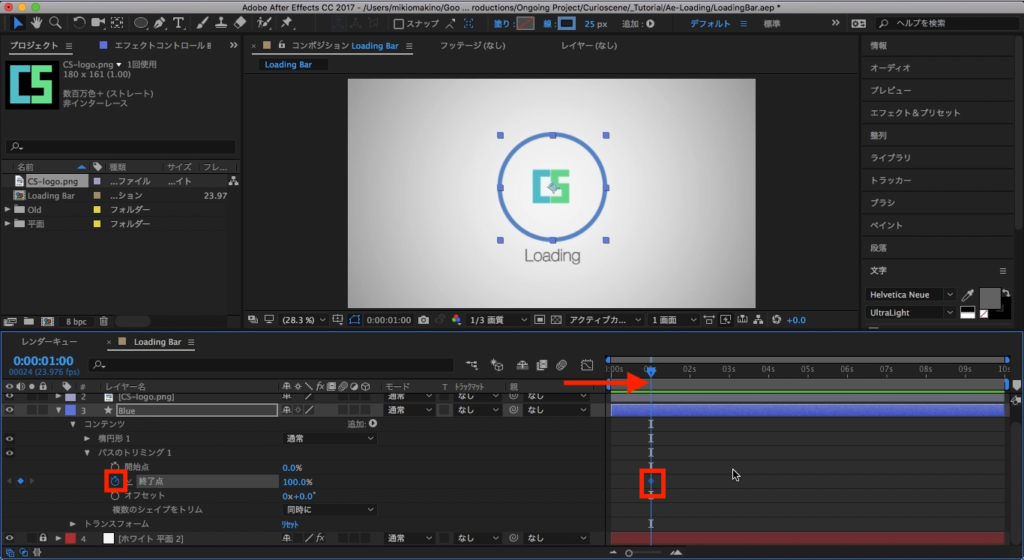 1秒にタイムインディケーターを持っていて、「終了点」のストップウォッチアイコンをクリックして現在の状態をキーフレームに追加します。