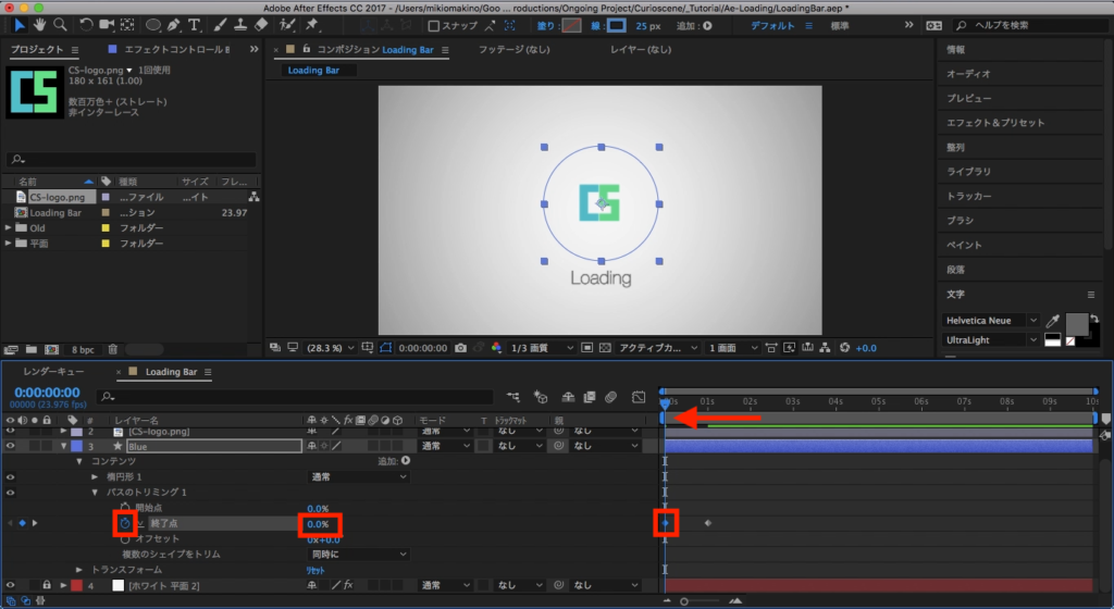 そしてタイムインディケーターを0秒に移動させて、「終了点」の数値を「0%」に変更し、キーフレームを追加します。こうすることで、線が時計回りに動くアニメーションが完成しました。