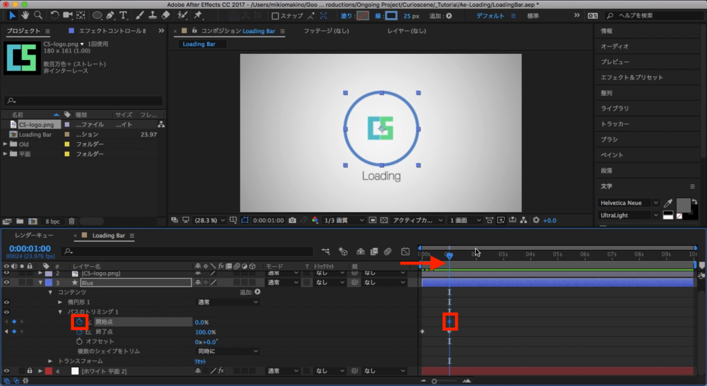 次はタイムインディケーターを1秒に移動させて、「開始点」のストップウォッチアイコンをクリックし、現在の状態をキーフレームに追加します。