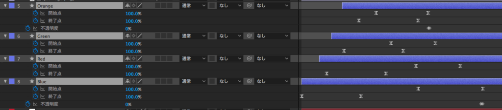 こちらでは「終了点」ではなく「開始点」を動かす事になるので、最後のシェイプが先に開始点が「100%」になり、他のレイヤーに続くようにそれぞれの開始点のキーフレームを動かして微調整していきましょう。