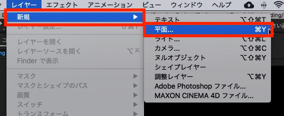 コンポジション追加後は、上部メニューから「レイヤー」、「新規」、「平面」を選択して、背景を付け足します。