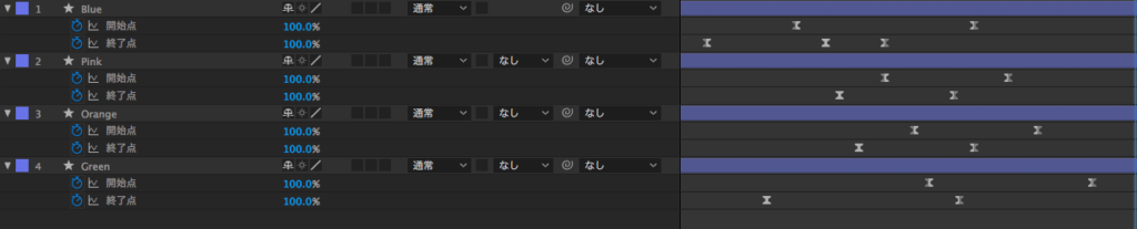 こちらのモーショングラフィックスで難しいと思われるのがタイミングの調整です。先程の項目では青→赤→緑→オレンジの順番に表示させることができたと思いますが、今度はオレンジ→緑→赤→青のタイミングでアニメーションが終わるように調整していきます。