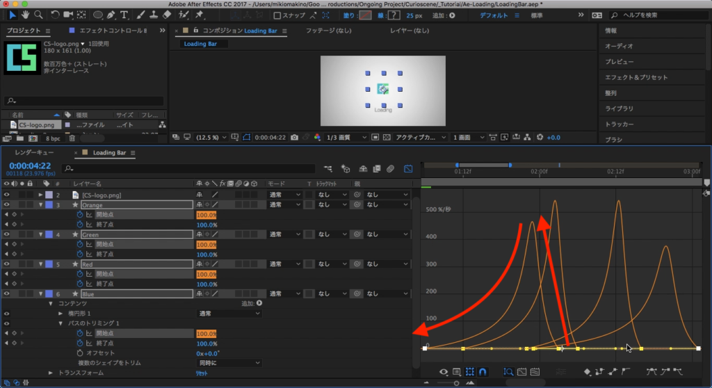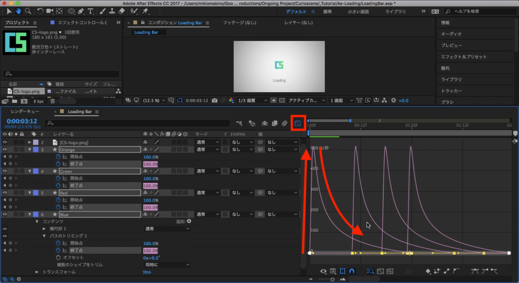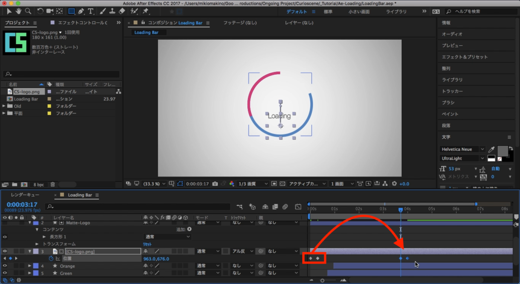 そしてロゴにある全てのキーフレームを選択し、イージングを追加、必要に応じてグラフエディターの調整やモーションブラーを付け加えると良いでしょう。そして最後は「Loading」のテキスト部分も同じ様に作っていけば完成です。