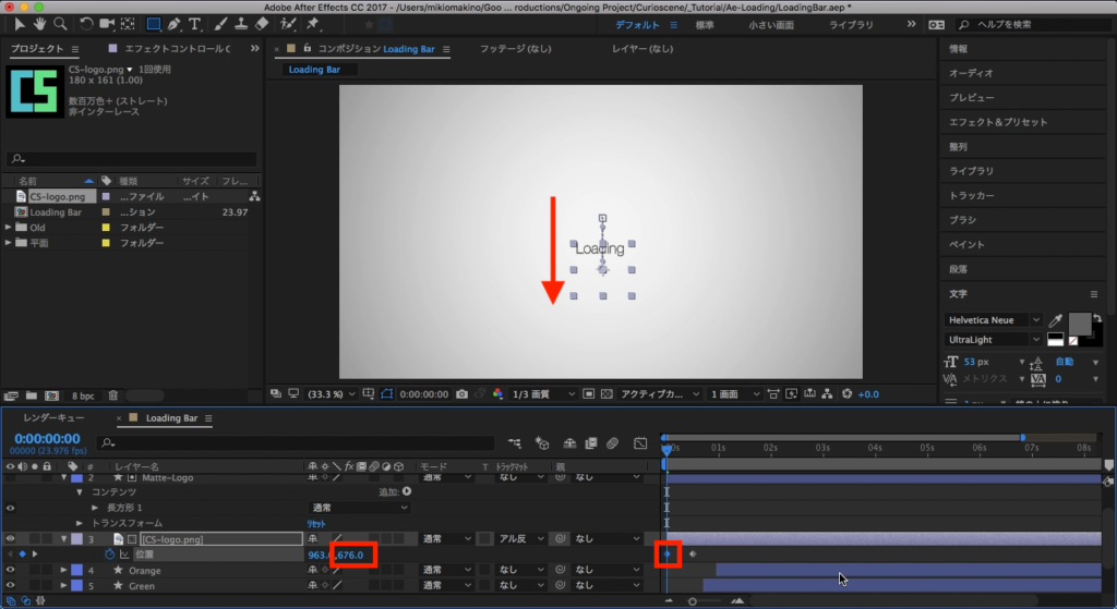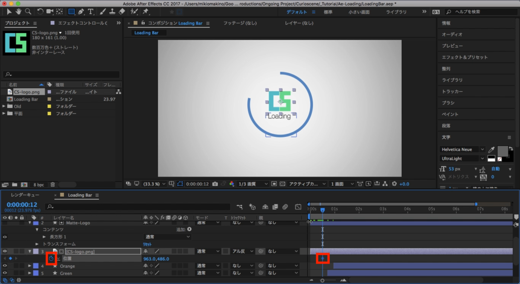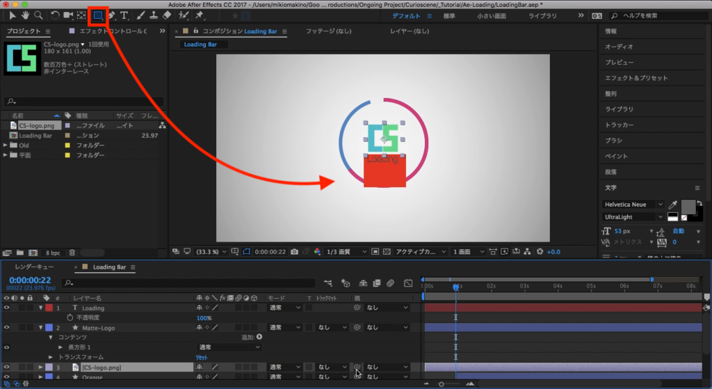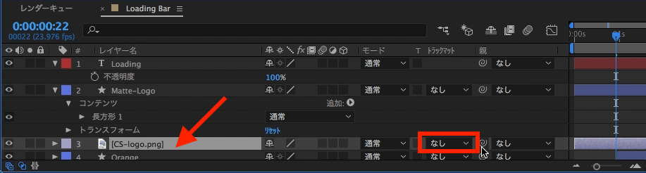ここからは完全にオプションになりますが、チュートリアルに合わせて作りたい場合は参照にしてみると良いでしょう。ちなみに、ロゴと「Loading」のテキストはトラックマットを使用して表示させました。まずロゴが隠れるくらいの大きさのシェイプを真下に追加し、ロゴの真上に来るようにタイムラインの整列を行います。わかりやすいように「Matte-Logo」のように名前を変更すると良いでしょう。