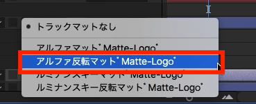 今度はロゴのレイヤーを選択し、トラックマットの項目から「アルファ反転マット」を選択します。もしトラックマットが表示されない場合は、下の「スイッチ/モード」のボタンをクリックすると表示されます。